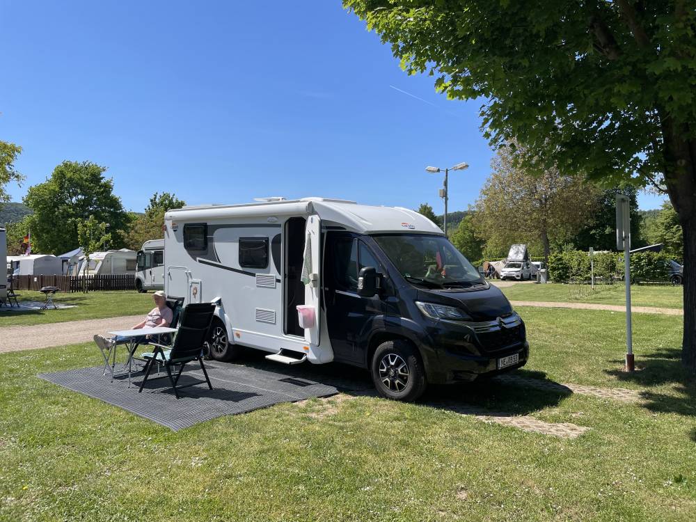 Das war es dann aber leider auch schon mit den positiven Eigenschaften. Generell ist der Platz leider reichlich renovierungsbedürftig: kaum eine Weg bei dem die Asphaltdecke nicht aufgerissen ist, die sanitären Einrichtungen sind gerade noch so hinnehmbar und die Entsorgungsstation liegt irgendwie so, dass man aufpassen muss nicht in die Grubenöffnung für das Grauwasser zu treten. Vor den Toiletten hängt zwar ein Zettel „… der Zustand der sanitären Einrichtungen ist uns bewusst, wir warten auf die Genehmigung der Behörden“ oder so ähnlich, aber was hilft das? Egal ob verpasste regelmäßige Renovierungen und / oder verspätet eingereichte Anträge, hier verliert der Platz und wir würden ihn nicht wieder anfahren. Die Lage mit der erwähnten Lage am Rhein ist sicher klasse, aber sich umdrehen und den Platz ansehen darf man halt nicht …